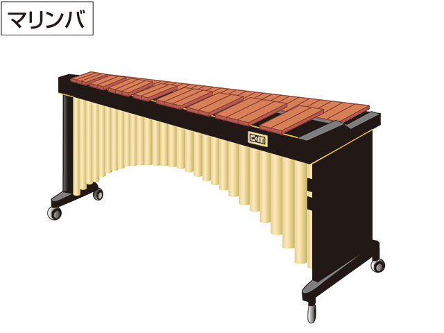 マリンバは音程のある打楽器で、ピアノの鍵盤のように並んだ木製の音板をたたくと音が鳴ります。